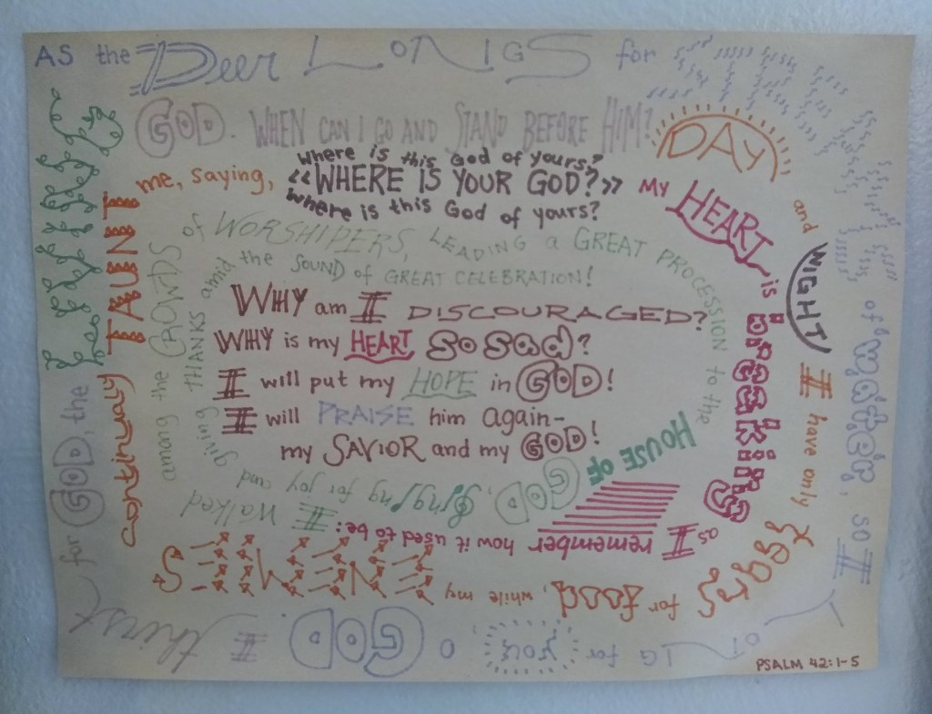 This morning as I prayed for a friend with severe chronic illness, I was drawn to this artistic rendering of Psalm 42:1-5, which Val made for Karis on one of her tough days. It’s hung on our wall for years and has faded, but I think you can still read it. I need this challenge today, to remember and seek the Lord’s unfailing love, poured out for THIS day.