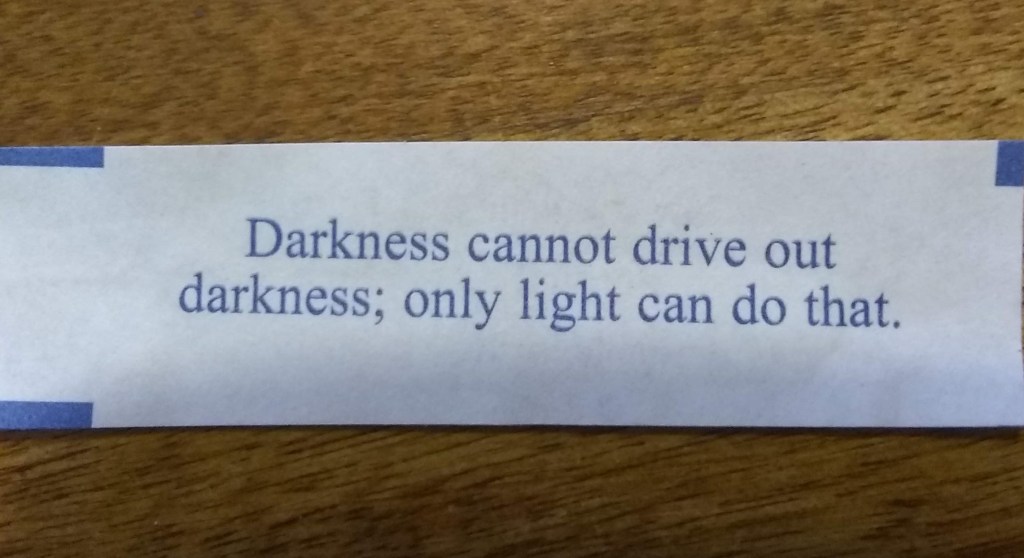 “Darkness cannot drive out darkness; only light can do that,” my fortune cookie tells me.