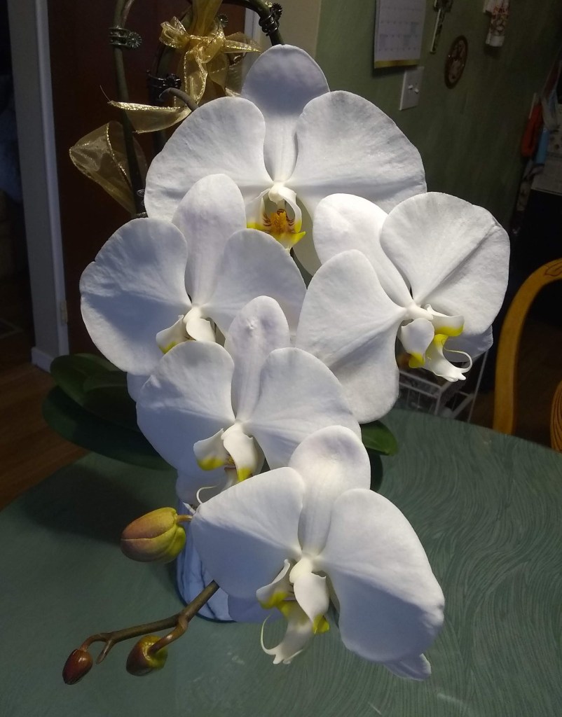 I’ve been receiving advice about how to care for this orchid. So far, though, all we’ve done is give it a half cup of water every week. And apparently it likes the window where it is placed. It’s a picture for me of partnership. Had we not watered it, the orchid would have died. But the orchid itself has done all the rest. If it’s like it was last fall, these blooms will last for weeks, reminding us daily of the beauty of Dan and April’s lives and their love for each other even though we can’t be with them physically right now.