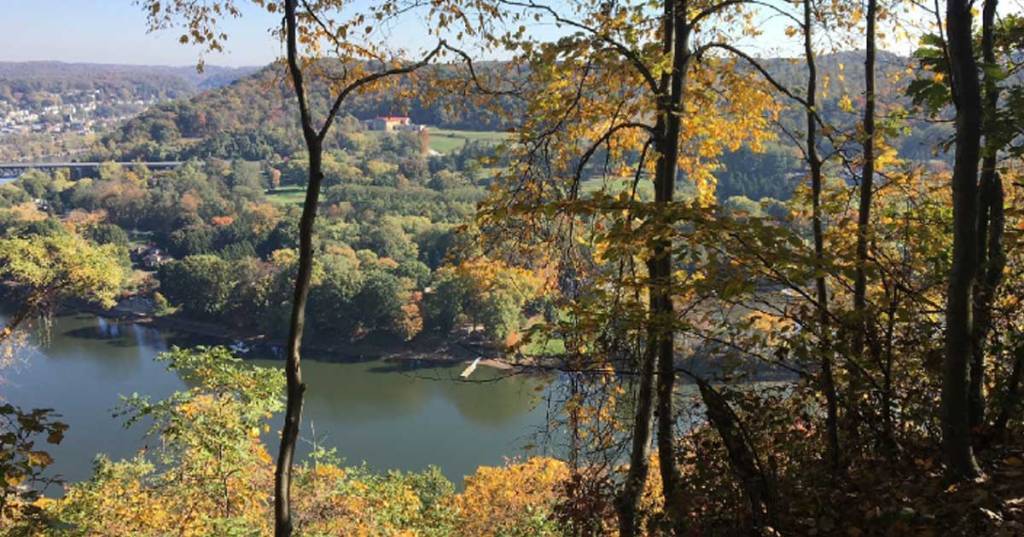 Part of the trail at Harrison Hills Park lies along the edge of a bluff above the Allegheny River.