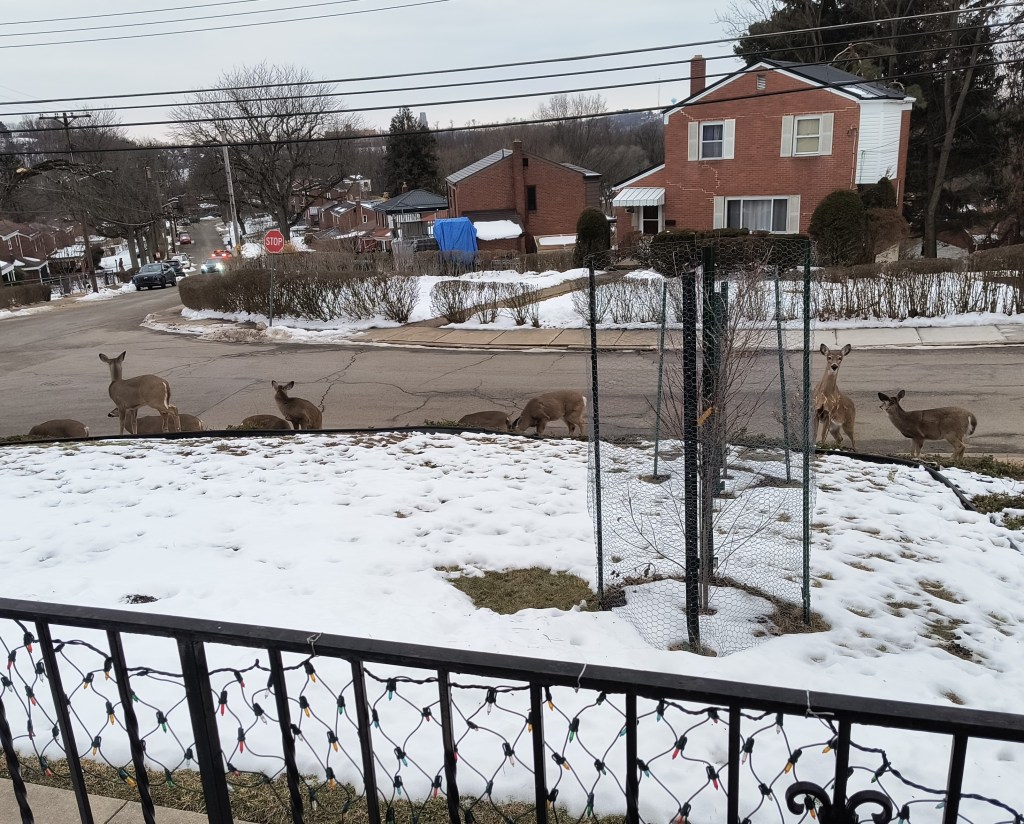 My granddaughter Juliana spent 24 hours with me while her mom and sister Liliana visited Valerie and family in São Paulo, Brazil. She loved watching neighborhood deer eat groundcover on our front slope–nine of them this time!