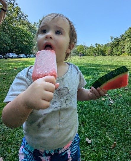 I take a moment to observe my youngest granddaughter, deftly managing a popsicle in one hand and watermelon in the other.