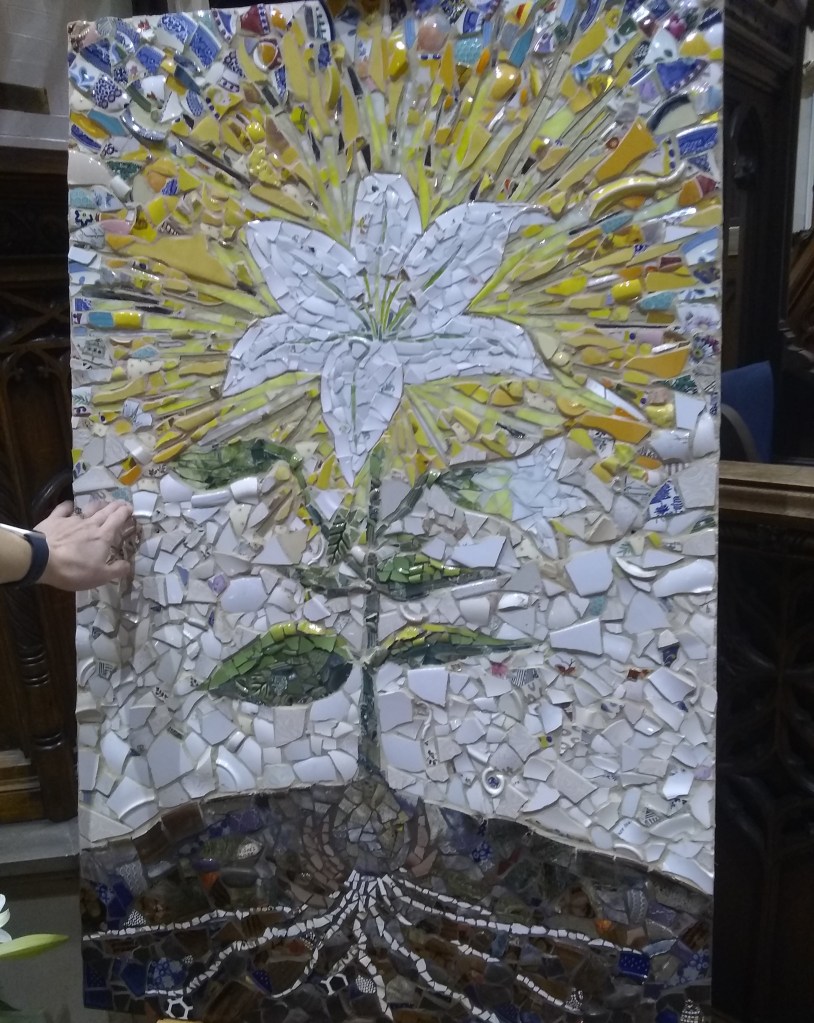 This year, when the lights came on, we also saw an amazing mosaic at the front of the church. This also requires a bit of context, going back to Ash Wednesday, Feb. 22. We were invited to bring to that service a piece of pottery from home, which we placed in a big metal tub and smashed with hammers at the end of the service, to illustrate our brokenness.